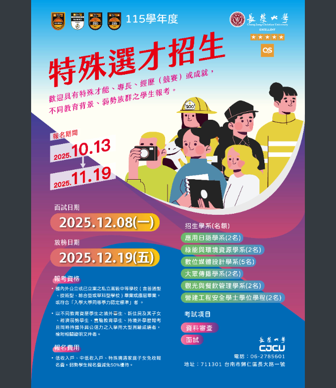 [特殊選才]轉知長榮大學115學年度特殊選才招生資訊Post author:註冊組長Post published:2025-10-02Post category:升學資訊 / 註冊組 / 首頁公告長榮大學115學年度特殊選才招生資訊下載招生簡章下載招生海報下載 Post Views: 31註冊組長註冊/成績/重補修/學習歷程/各式助獎學金/大學升學各式報名作業相關內容[訊息轉知]檢送本校「第十五屆文藻盃全國高中職日文朗讀比賽」簡 章乙份,敬請協助公告並請鼓勵貴校學生踴躍參加。2024-09-12[教師甄選]國立基隆高級中學111學年度第2次專任教師甄選進入複試人員名單2022-12-20[活動轉知]銘傳大學舉辦之第十三屆「發現銘傳- 大學生換你做做看」活動2022-10-25
