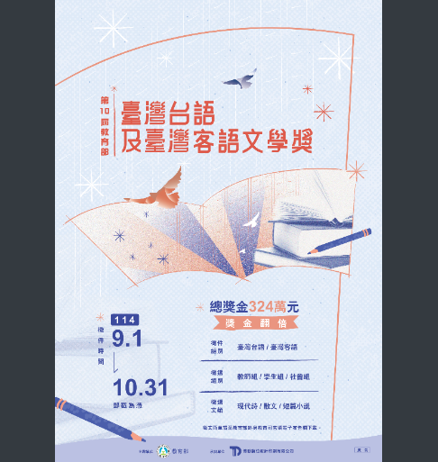[活動轉知]第十屆教育部臺灣台語及臺灣客語文學獎Post author:教學組長Post published:2025-10-08Post category:教學組 / 最新公告 / 活動訊息 / 訊息轉知第十屆教育部臺灣台語及臺灣客語文學獎-2下載第十屆教育部臺灣台語及臺灣客語文學獎簡章下載第十屆教育部臺灣台語及臺灣客語文學獎下載 Post Views: 5相關內容[訊息轉知]國立公共資訊圖書館《微光筆觸下的光影-原創之星100圓夢繪本展》相關資訊,敬請協助轉知所屬學校及圖書館等機關 (構),並協助宣傳與鼓勵蒞臨觀展2025-05-07[訊息轉知] 財團法人正覺教育基金會辦理生命教育教師研習活動「生命的圓滿—尋覓教師的春天」2025-09-11[訊息轉知]國立中山大學圖書與資訊處辦理「第24期圖書館專業人員在職進修學分班」上學期招生簡章,敬請惠予轉知所屬圖書館,鼓勵在職人員參加並予公差假2024-07-11
