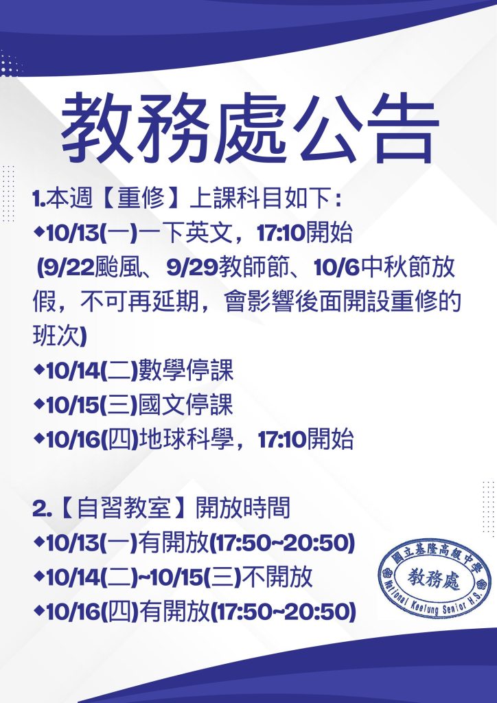 [重要公告]有關重補修上課時間及自習教室開放時間Post author:教學組長Post published:2025-10-13Post category:教學組 / 最新公告 / 置頂公告 / 重要公告 / 首頁公告 Post Views: 39相關內容[訊息轉知]本校謹訂於112年3月18日、3月25日、4月15日舉辦教育部人文社科苗圃分區資源中心計畫 子計畫三:青年世代健康永續—Mission VS. Vision 2030未來企業的想像「運動表現X未來智能衣工作坊」,敬邀貴校院教師踴躍參加,並惠予公告,請查照。2023-03-07【優免備取報到】113學年度優先免試入學備取生報到人數2024-06-18[訊息公告]114學年度校務會議職員代表當選名單2025-07-08