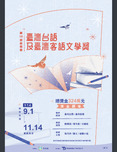[活動轉知]有關本部「第十屆教育部臺灣台語及臺灣客語文學獎」徵文時間展延至114年11月14日,請協助轉知並鼓勵貴校師生踴躍參加,請查照
