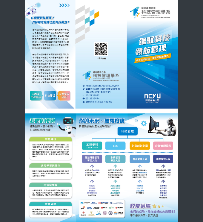 轉知國立嘉義大學管理學院科技管理學系介紹摺頁電子檔Post author:註冊組長Post published:2025-11-27Post category:升學資訊 / 註冊組 / 首頁公告國立嘉義大學管理學院科技管理學系介紹摺頁電子檔下載介紹摺頁電子檔下載 Post Views: 7註冊組長註冊/成績/重補修/學習歷程/各式助獎學金/大學升學各式報名作業相關內容[活動轉知]國立高雄師範大學「2023入學最前線」招生線上說明會2023-03-01[活動轉知]國立海洋科技博物館-打造一個智能又耐震的博物館2022-08-16[訊息轉知]「彩墨山水」系列講座2025-03-10