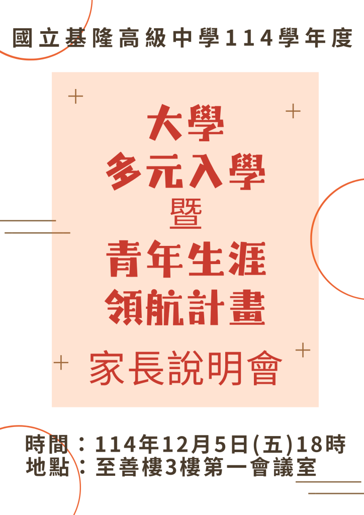 [訊息轉知] 基隆高中114學年度 大學多元入學暨青年生涯領航計畫家長說明會 114年12月5日(五)18時Post author:輔導室Post published:2025-12-04Post category:訊息轉知 / 輔導室 / 首頁公告 Post Views: 8相關內容[訊息轉知]國家青年交響樂團暑期活動甄選2025-02-24[活動轉知]檢送「114年度外交小尖兵英語種籽隊培訓營」實施計 畫及輔導教師遴選實施計畫各1份,請鼓勵所屬師生踴躍 報名參加,請查照。2025-01-16[訊息轉知]轉知國立故宮博物院(以下簡稱該院)111年「年報」電子檔,歡迎各機關參考運用2023-10-02