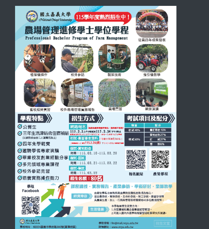 轉知國立嘉義大學農場管理進修學士學位學程115學年度農業公費專班招生資訊Post author:註冊組長Post published:2026-01-05Post category:升學資訊 / 註冊組 / 首頁公告國立嘉義大學農場管理進修學士學位學程115學年度農業公費專班招生資訊下載國立嘉義大學115學年度農場管理進修學士學位學程考試入學招生簡章下載國立嘉義大學農場管理進修學士學位學程招生海報1下載國立嘉義大學農場管理進修學士學位學程招生海報2下載 Post Views: 16註冊組長註冊/成績/重補修/學習歷程/各式助獎學金/大學升學各式報名作業相關內容[活動轉知]臺中工業高級中等學校「2022全國智慧製造應用競賽暑期營隊」招生簡章2022-05-18[訊息轉知]「113學年度全國學生音樂比賽實施要點」2024-06-28[訊息轉知]轉知中央流行疫情指揮中心修訂「嚴重特殊傳染性肺炎」病例定義並自本(112)年3月20日起適用,相關防治措施調整案更正說明2023-03-30