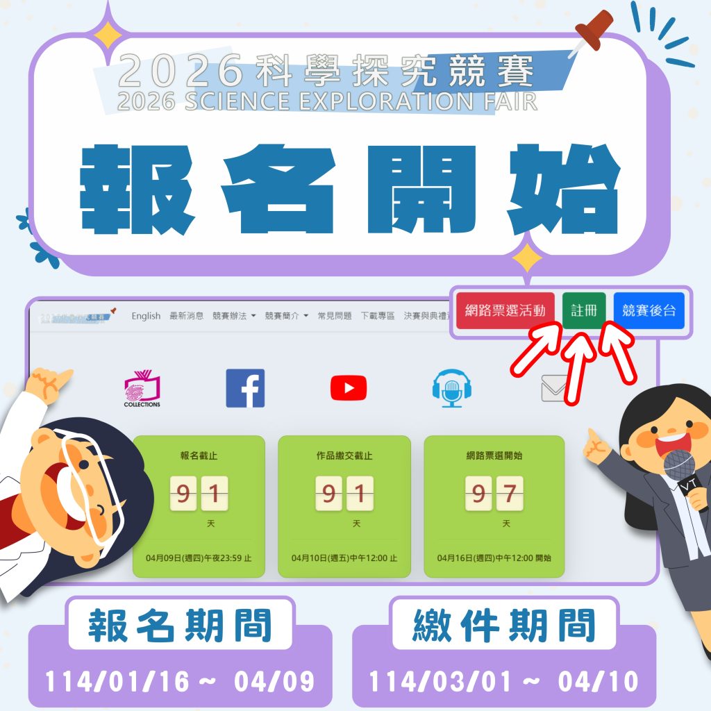 2026年「科學探究競賽-這樣教我就懂」活動Post author:設備組Post published:2026-01-27Post category:學生活動 / 首頁公告競賽報名時間:115年1月16日~ 4月9日止。作品繳交時間:115年3月1日~ 4月10日中午12時止官網:https://sciexplore2026.colife.org.tw有興趣參賽之同學可先找指導老師討論 Post Views: 26相關內容[訊息轉知]教育部國民及學前教育署普通型高級中等學校藝術生活學科中心與國立彰化女子高級中學辦理之「音樂Live Coding」全國教師研習實施計畫2025-12-02[訊息轉知]國立臺灣師範大學幼兒與家庭科學學系承辦教育部USR計畫「2024年我行!我不塑!」減塑與永續徵件競賽2024-03-27[訊息轉知]「國人赴柬埔寨工作遭詐騙」、「海外求職宣導警語」相關宣導資料2022-07-06