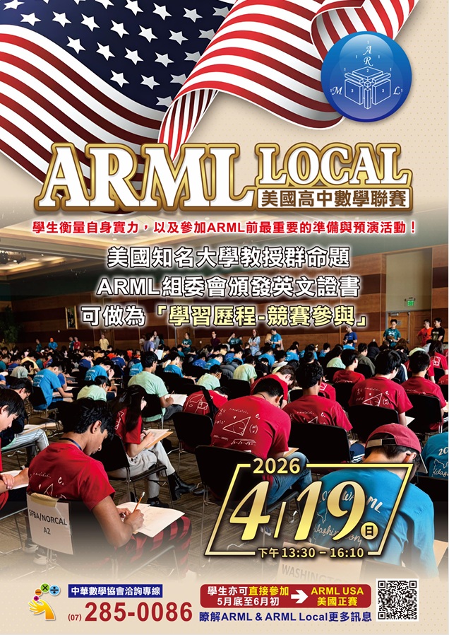 2026 ARML Local 美國高中數學聯賽Post author:設備組Post published:2026-02-03Post category:學生活動報名自即日起至115年3月17日止競賽方式為由高中生6人組成一隊,共同協作完成個人賽、接力賽及團體賽三個項目詳細請參閱附件美國高中數學聯賽下載 Post Views: 15相關內容[活動轉知]國立屏東科技大學無人載具應用研發中心辦理「111年度高中職師生營: 無人機智慧農林應用與操作實務研習營」研習活動2022-09-27[活動轉知]內政部移民署辦理「112年新住民子女多元文化在地創生培育營」,延長報名收件截止日至112年5月19日(星期五)2023-05-23[活動轉知]逢甲大學中國文學系謹訂於111年7月7日至7月8日辦理「字‧聚:中區高中生文藝營」2022-05-31