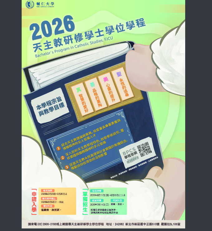 轉知輔仁大學學校財團法人輔仁大學天主教研修學士學位學程115學年度學士班招生相關資訊Post author:註冊組長Post published:2026-02-23Post category:升學資訊 / 註冊組 / 首頁公告輔仁大學學校財團法人輔仁大學天主教研修學士學位學程115學年度學士班招生相關資訊下載招生海報下載 Post Views: 10註冊組長註冊/成績/重補修/學習歷程/各式助獎學金/大學升學各式報名作業相關內容[活動訊息] 2025良師益友計畫2024-11-22[訊息轉知]112年度金融基礎教育教學實施成果徵選辦法2023-03-22[活動轉知]有關本校辦理「高中生面對永續發展目標SDGs探究與實作學習成果研討會」,歡迎貴校鼓勵所屬學生踴躍報名參加,詳如說明,請查照。2024-04-22
