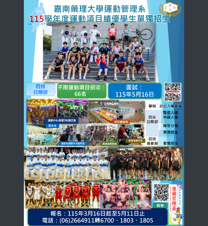 轉知嘉藥學校財團法人嘉南藥理大學「115學年度四年制重點運動項目績優學生單獨招生」簡章及海報相關資訊Post author:註冊組長Post published:2026-03-17Post category:升學資訊 / 註冊組 / 首頁公告嘉藥學校財團法人嘉南藥理大學「115學年度四年制重點運動項目績優學生單獨招生」簡章及海報相關資訊下載招生簡章-3下載招生海報-1下載 Post Views: 7註冊組長註冊/成績/重補修/學習歷程/各式助獎學金/大學升學各式報名作業相關內容[訊息轉知]「花蓮縣112學年度縣立體育高級中等學校新聘校長遴選簡章」1份2023-07-04[訊息轉知]逢甲大學辦理圖書資訊專業學分班(第18期)相關訊息,請有意願者踴躍報名參加,請查照。2023-12-20[教師活動]第5屆中學生黑客松2025-04-26