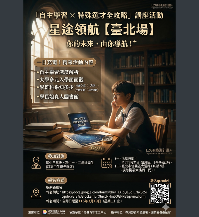 轉知社團法人臺灣愛行動協會教育部青年發展署青志奬績優團隊「綠洲計畫LZGH」辦理「自主學習 × 特殊選才全攻略」講座活動資訊Post author:註冊組長Post published:2026-03-19Post category:學生活動 / 註冊組 / 首頁公告社團法人臺灣愛行動協會教育部青年發展署青志奬績優團隊「綠洲計畫LZGH」辦理「自主學習-×-特殊選才全攻略」講座活動資訊下載活動DM下載 Post Views: 7註冊組長註冊/成績/重補修/學習歷程/各式助獎學金/大學升學各式報名作業相關內容[訊息轉知]國立臺中教育大學辦理「環境教育30+3小時核心課程研習班」2023-09-25[訊息轉知]檢送教育部以113年2月7日臺教師(二)字第1132600192A號令修正發布「師資培育公費助學金及分發服務辦法」部分條文,檢送原函文、發布令影本、修正條文、修正總說明及修正對照表各1份,請查照2024-02-22[訊息轉知]「113學年度區域策略聯盟-樂世代傳聲III」2025-05-06