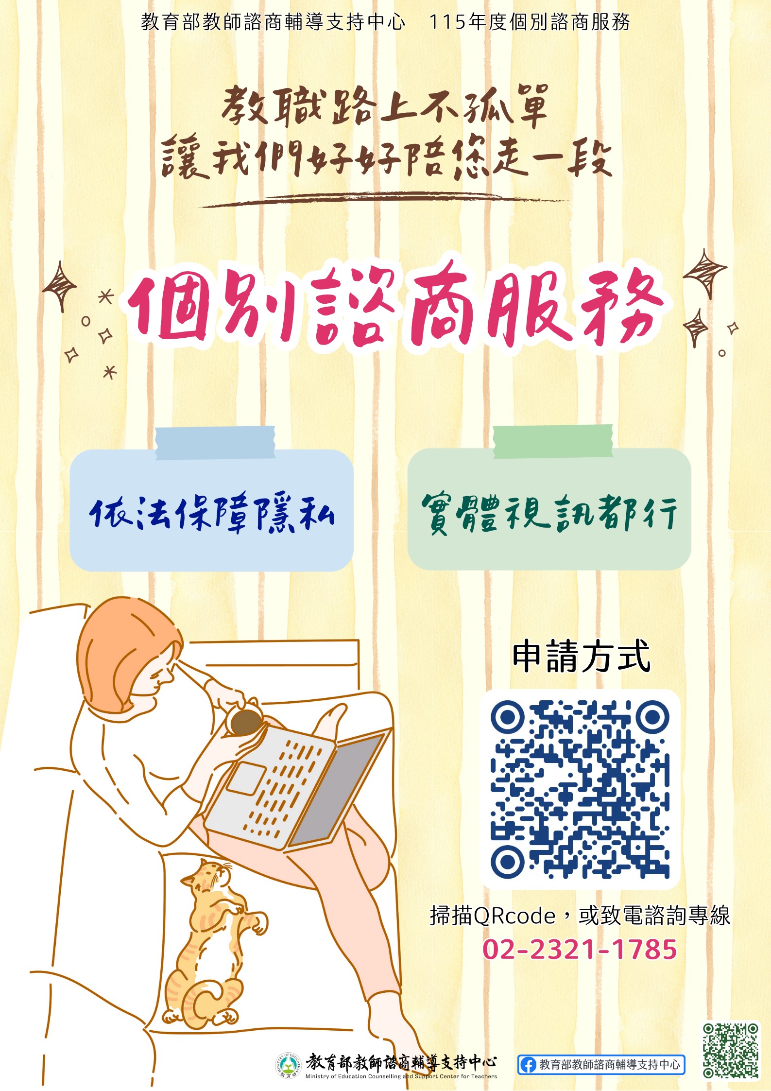 [訊息轉知]教育部教師諮商輔導支持中心個別諮商輔導服務Post author:人事室Post published:2026-03-20Post category:人事室 / 友善職場 / 最新公告 / 首頁公告教育部教師諮商輔導支持中心個別諮商輔導服務函下載宣傳海報下載 Post Views: 7相關內容轉知外交部領事事務局LINE官方帳號自本(112)年元月起舉辦「童趣寶島春來波鴿」新春旅外安全有獎徵答及「出國登錄月月抽」活動。2023-01-10[教師研習]新興科技線上講座:生成式AI在教學上的應用與實踐・帶狀數位工作坊2024-02-29[教師甄選]國立基隆高級中學111學年度第2次專任教師甄選進入複試人員名單2022-12-20