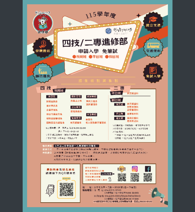 轉知國立臺中科技大學進修部115學年度四技、二專單獨招生訊息Post author:註冊組長Post published:2026-04-16Post category:升學資訊 / 註冊組 / 首頁公告國立臺中科技大學進修部115學年度四技、二專單獨招生訊息下載招生海報下載 Post Views: 7註冊組長註冊/成績/重補修/學習歷程/各式助獎學金/大學升學各式報名作業相關內容[活動轉知]檢送本校舉辦中國醫藥大學第四屆全國中醫藥書法比賽實 施辦法乙份,敬請鼓勵所屬踴躍報名參加,請查照。2025-02-24[活動轉知]南臺科技大學「數位設計學院OPEN DAY五系聯合開放日:一日大學生體驗活動」2023-02-15[訊息轉知] 【104人力銀行】提供「104學測落點分析」幫助學生完成個人申請志願選填、提供教師教學簡報,歡迎多加運用!2026-02-26