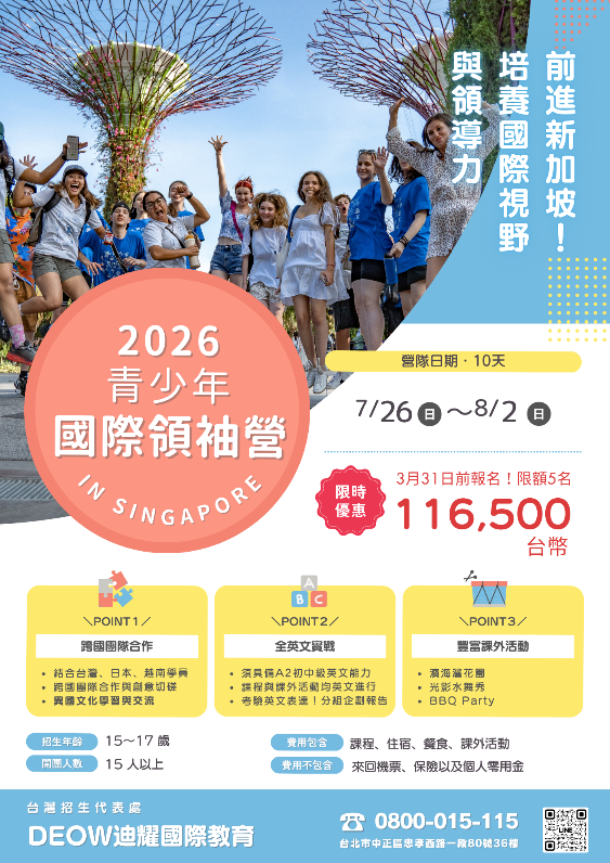 為鼓勵優秀學生參與國際交流並拓展視野,本公司特別針對「2026 新加坡青少年國際領袖營」推出【獎學金贊助選拔計劃】,提供具潛力與學習動機之學生申請參加,最高可獲得全額學費減免之機會。