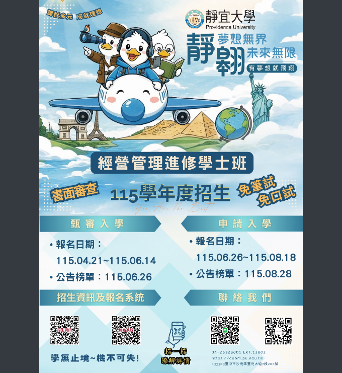 轉知靜宜大學經營管理進修學士班招生資訊Post author:註冊組長Post published:2026-04-24Post category:升學資訊 / 註冊組 / 首頁公告靜宜大學經營管理進修學士班招生資訊下載招生簡章-1下載招生宣傳海報下載 Post Views: 9註冊組長註冊/成績/重補修/學習歷程/各式助獎學金/大學升學各式報名作業相關內容【訊息轉知】國立政治大學辦理行政碩士在職專班113學年度招生簡章系所分則及招生。2023-11-07[活動轉知]國立高雄師範大學於111年3月12日(星期六)舉辦「2022入學最前線」招生說明會2022-02-07轉知國立臺南大學體育學系115學年度重點運動項目績優學生單獨招生考試資訊2026-01-19